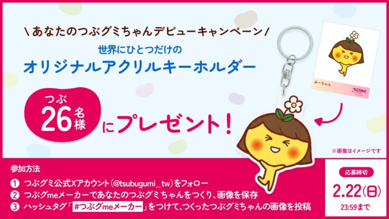 - お知らせ キャンペーン 【プレスリリース】組み合わせは”無限”!?『つぶグmeメーカー』であなただけのつぶグミちゃんをつくろう!