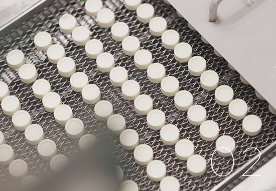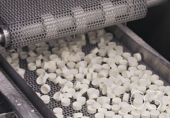 全長約100mの長いコンベアの上に並んだラムネの水分を、およそ60〜70℃でじっくり飛ばし乾燥させます。じゅんわり溶けて広がるラムネの誕生です。