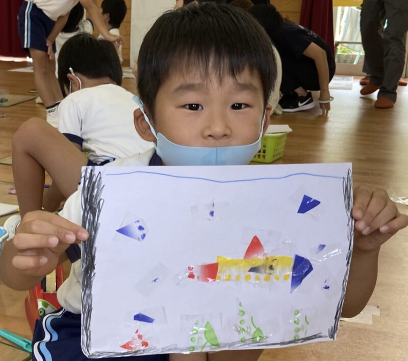 幼稚園や保育園、こども園では、みんなでお絵かきする機会がたくさんあります。それぞれの子どもが、自分が一番描きたいものを選んで、ちからいっぱい描いている姿ってとっても気持ちがいいものです。下の絵は海を描いているのでしょうか。潜水艦が真ん中にかっこよく描かれ、その周りに海の生き物や海藻などがあり、海の中の景色をさらに強調しています。